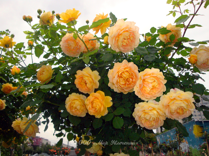 У этой розы гигантские, шаровидные цветки на элегантно поникающих ветвях. Цвет медно-желтый, необычный для английских роз. Если ближе рассмотреть лепестки, видно, что эффект создается за счет множества мелких розовых точек на глубоком желтом фоне. Запах сильный. Значительная устойчивость к заболеваниям. Превосходный сорт во всех отношениях, соединяющий в себе красоту,силу и элегантность. (DAER)