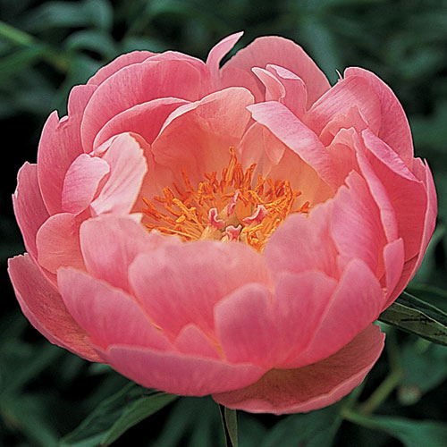 Полумахровый. Цветок изящный, розово-коралловый, позднее бежево-жёлтый. В центре масса жёлтых тычинок. Даже в сумерках цветок кажется пылающим, будто он освещён изнутри. При сильном солнечном освещении на одном и том же растении цветки могут быть разноокрашенные. Аромат лёгкий. Листва тёмно-зелёная. Высота 70 см. Раннего срока цветения