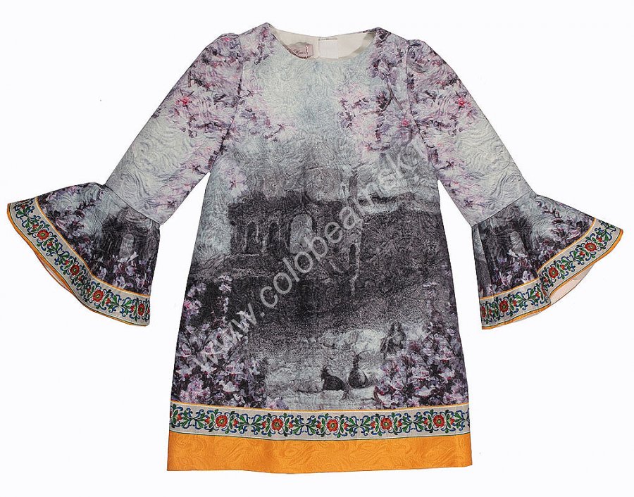 ПЛАТЬЕ ДЛЯ ДЕВОЧКИ, ДЛИННЫЙ РУКАВ С ВОЛАНОМ, ИЗ ЖАККАРДОВОЙ ТКАНИ С КРАСИВЫМ ПРИНТОМ, НА ХЛОПКОВОМ ПОДКЛАДЕ.