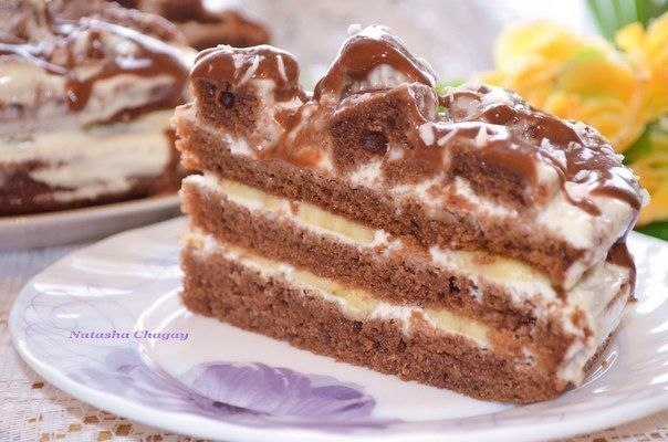 Нижний и средний корж смазать кремом, прослоить бананами, сложить друг на друга. Верхний корж смазать, но бананы не выкладывать.