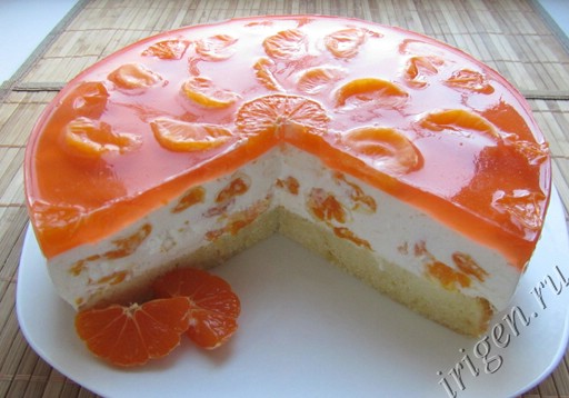 Достать торт из холодильника, разложить на поверхности суфле оставленные для украшения мандарины и залить остывшим желе. Подождать, пока желе схватится и поставить торт в холодильник