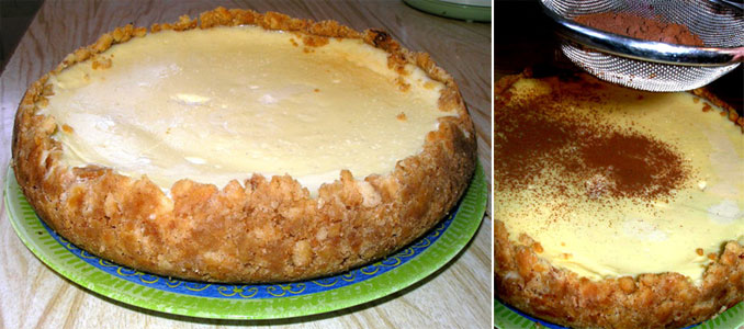 Сверху чизкейк густо засыпаем несладким какао, тертым шоколадом.